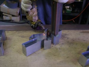 帯状のコバを一箇所ずつ曲げながらハンダ付けしているところ。